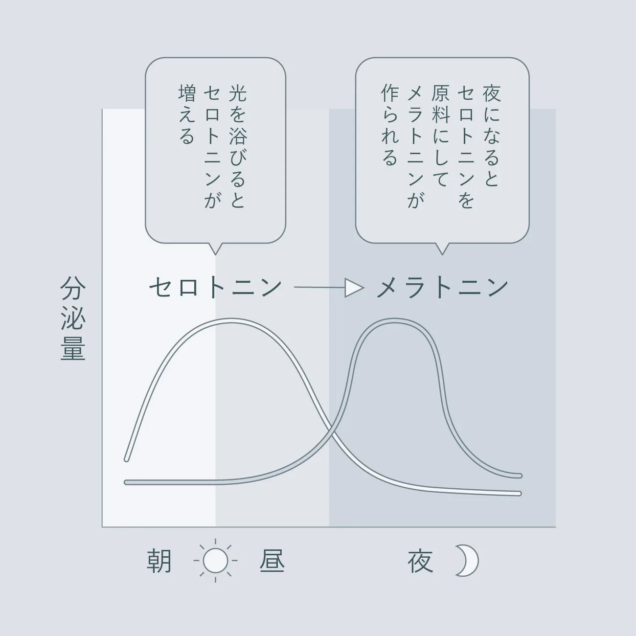 「朝日を浴びると、『幸せホルモン』として知られるセロトニンが分泌され、脳の興奮を抑え、心身をリラックスさせる効果があります。日が沈むとこのセロトニンを材料に、自然な眠りに誘う『睡眠ホルモン』メラトニンが分泌されるんです。朝日を浴びると、夜眠りやすくなる。だから夜なかなか眠れない人は、数日は眠くて辛くても、朝の光をしっかり浴びるサイクルに戻してあげることが大切なんです」