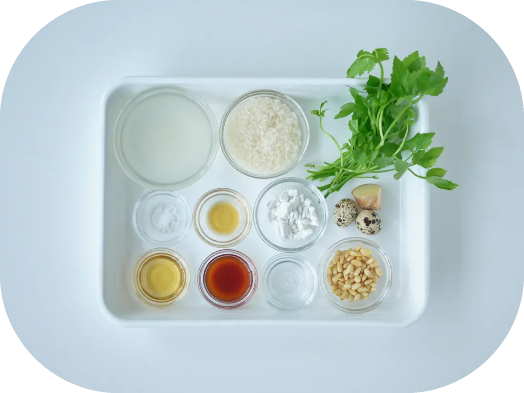 - 鍋に水4カップを入れて沸騰させ、1、松の実、米油を入れてひと混ぜし、中弱火で20分ほど炊く。塩を加え、混ぜる。